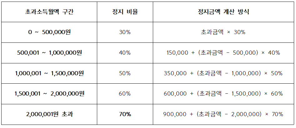 - 전년도 공무원 평균연금월액 2,740,000원을 초과한 금액에 따라 정지금액 산정