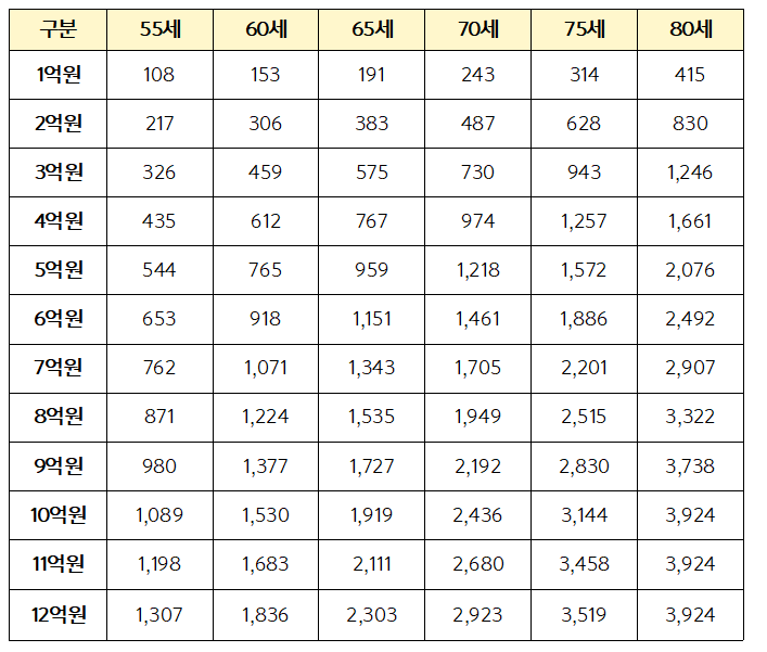 일반주택의 경우 70세 기준으로 3억 원 주택을 보유하고 있다면 월 약 89만 2천 원을 받을 수 있어요.