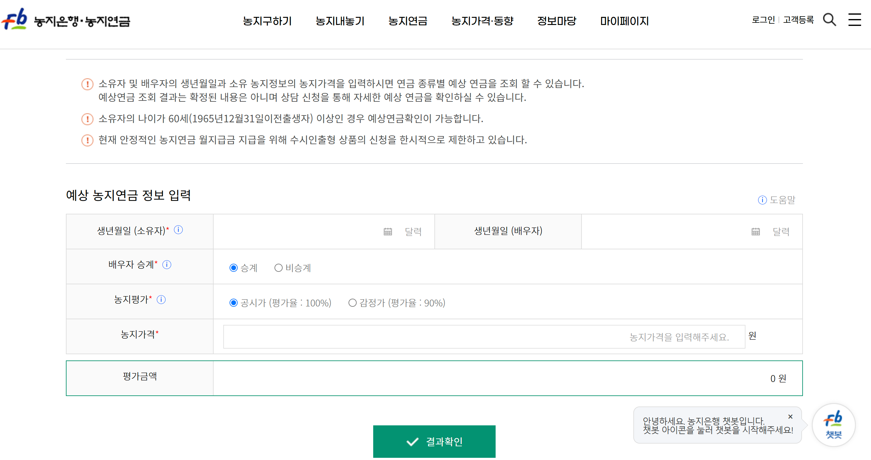 농지은행 농지연금 사이트 - 농지연금 - 예상연금 조회하기 화면에서 정보를 입력후 결과 확인을 누르시면 됩니다.