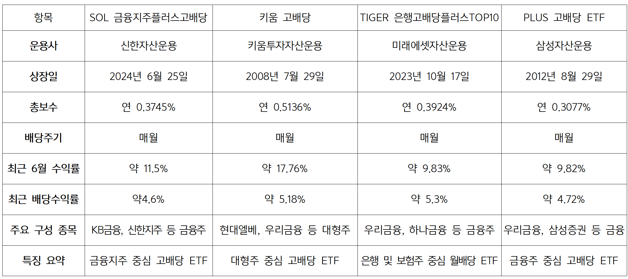 고배당 ETF에 관심 있는 투자자들을 위해 SOL 금융지주플러스 고배당, KIWOOM 고배당, TIGER 은행고배당플러스 TOP10, PLUS 고배당 ETF의 총 보수, 수익률, 배당률, ETF 특징 등을 상세히 살펴보고 투자 판단에 도움이 되도록 알아볼게요.