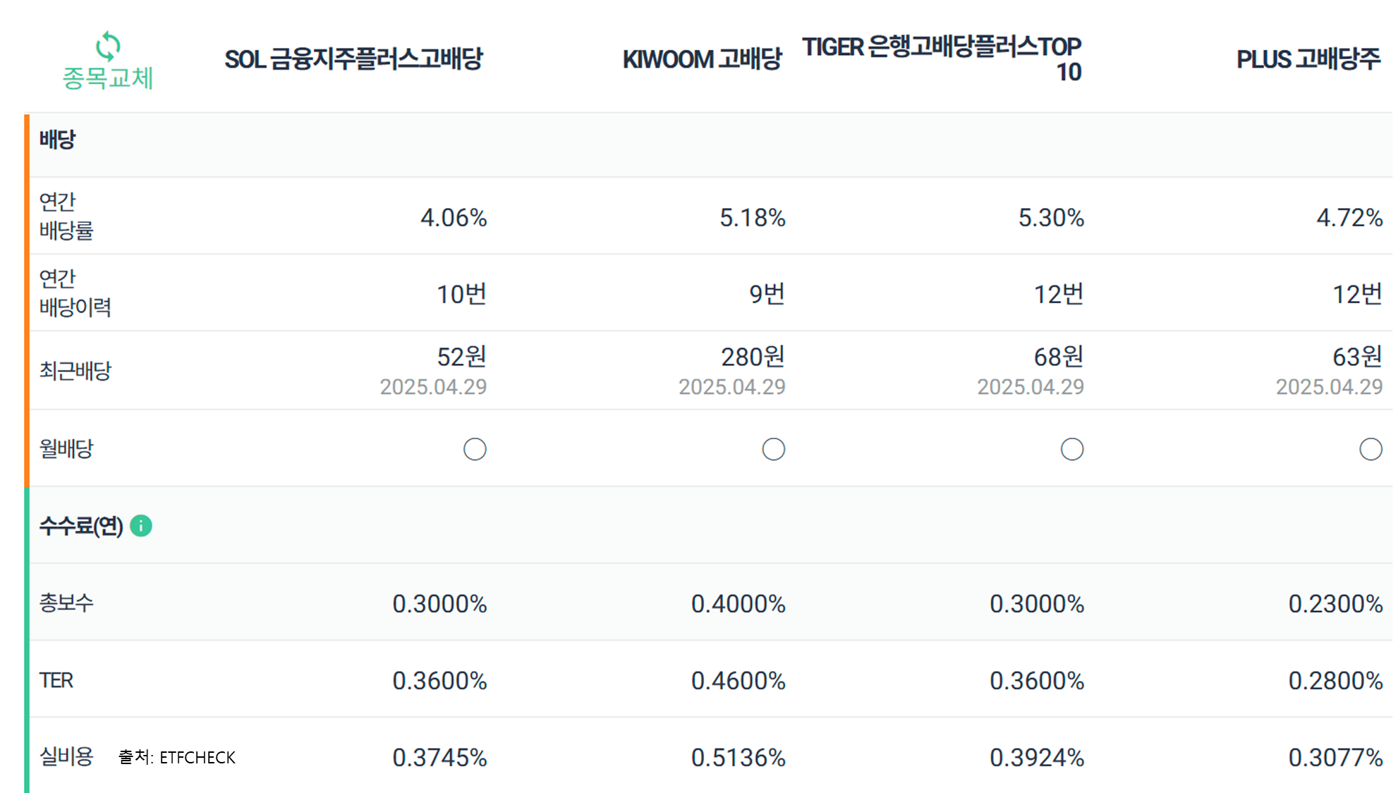 특징: 국내 금융주를 중심으로 구성된 고배당 ETF로, 안정적인 배당 수익을 추구하는 투자자에게 적합