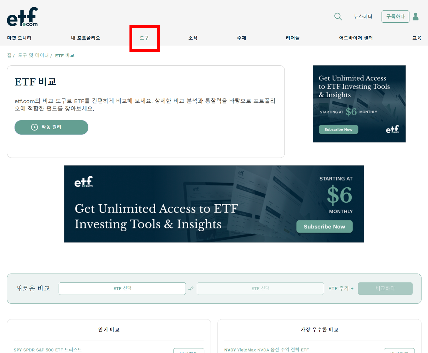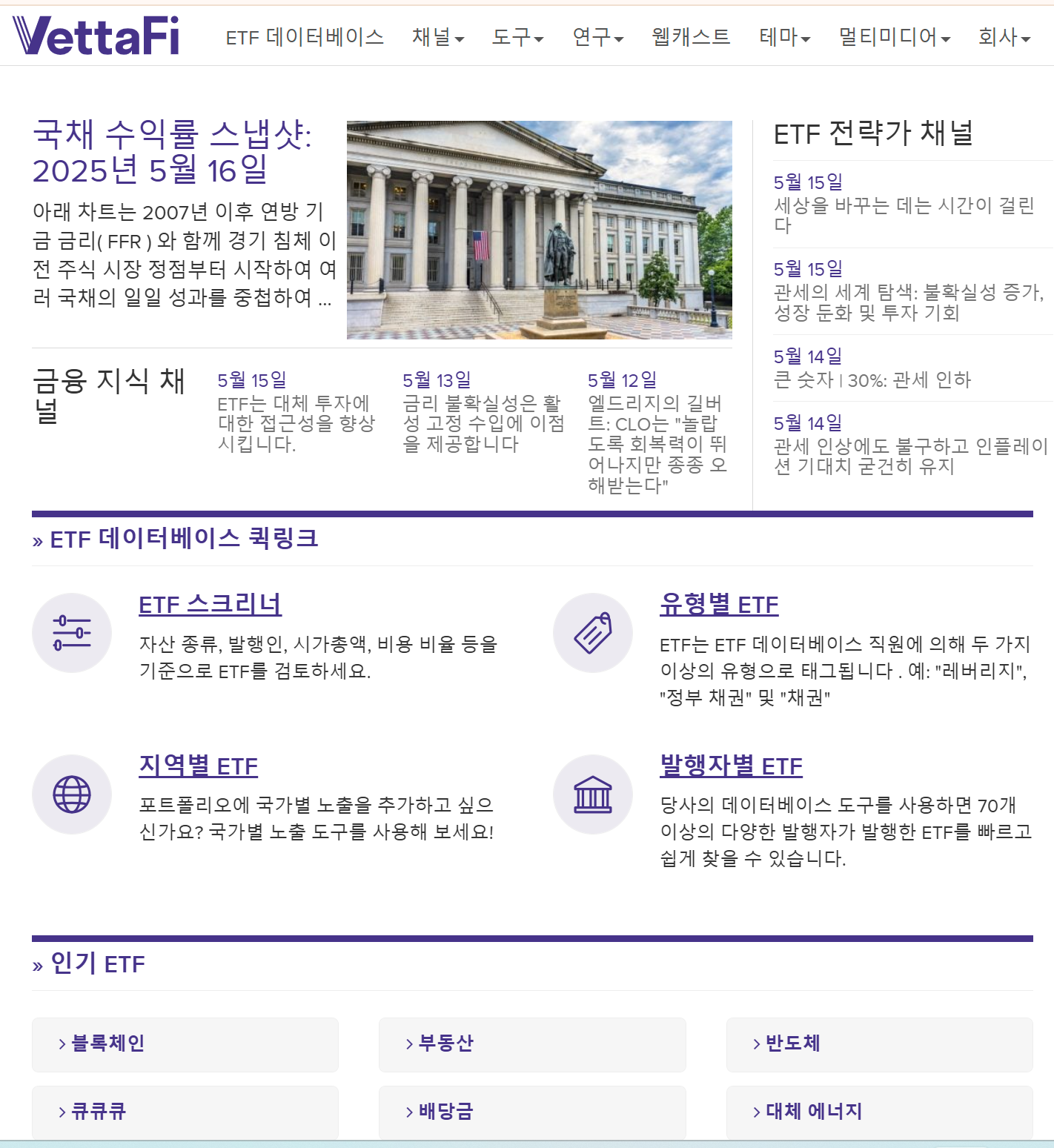 ETF.com은 ETF 관련 뉴스, 분석, 데이터베이스가 잘 갖춰진 전문 미디어 성격의 사이트입니다. ETF 업계 동향, 인기 ETF 순위, 수익률과 지표 기반 검색 등 고급 투자자에게도 유용한 정보가 많습니다.