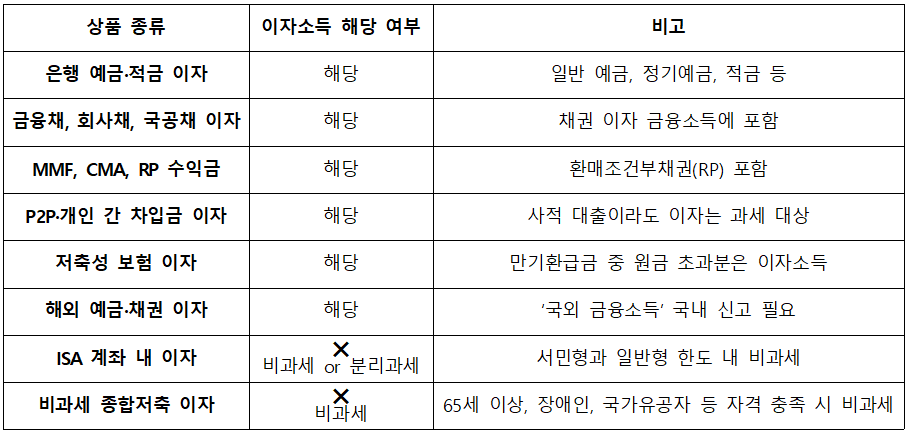 이자소득은 돈을 빌려주거나 예치해서 받는 수익인데요. 한눈에 보기 좋게 표로 정리해 드릴게요.