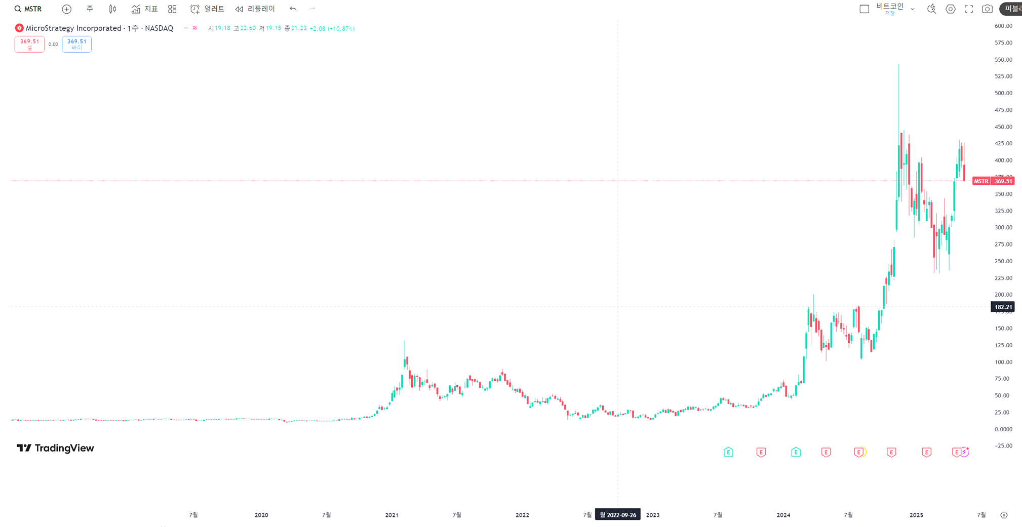 스트래티지는 비트코인 덕분에 2024년 한 해 동안 주가가 606%나 치솟으며 379달러까지 갔지만 이후 고점인 473달러에서 약 50% 하락했어요. 시장에서는 “MSTR 주가가 비트코인 가치보다 너무 비싸게 거래되고 있다”는 고평가 논란이 있었어요.