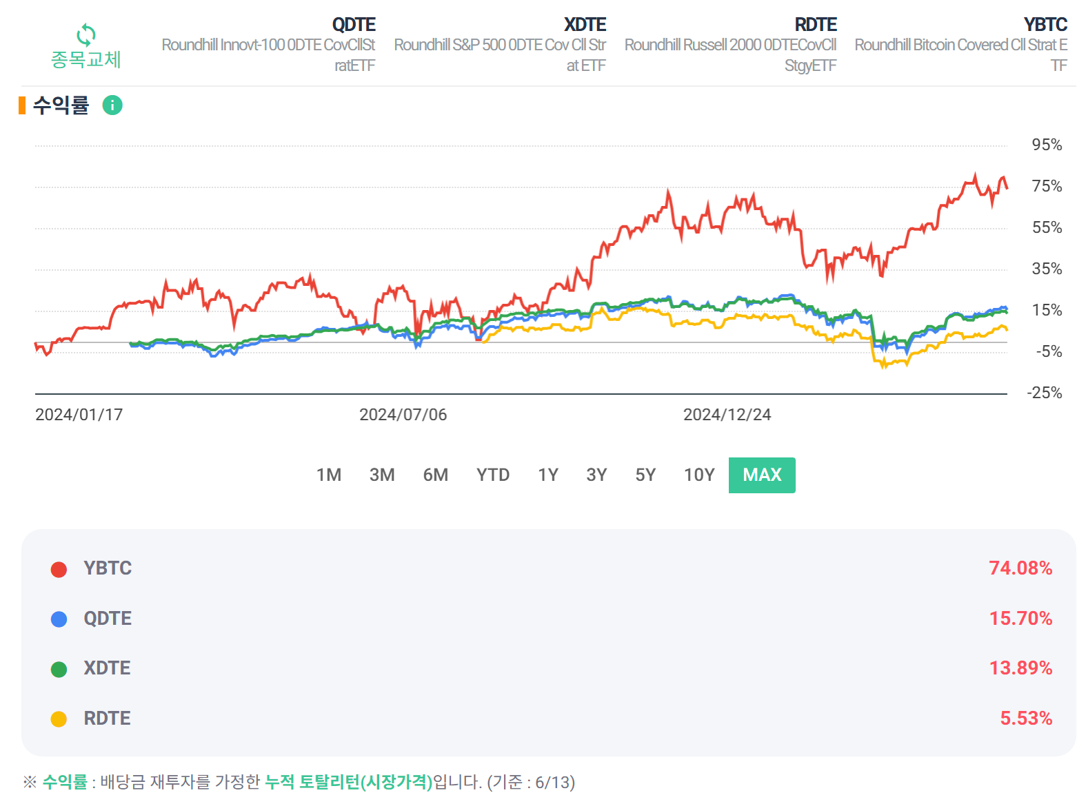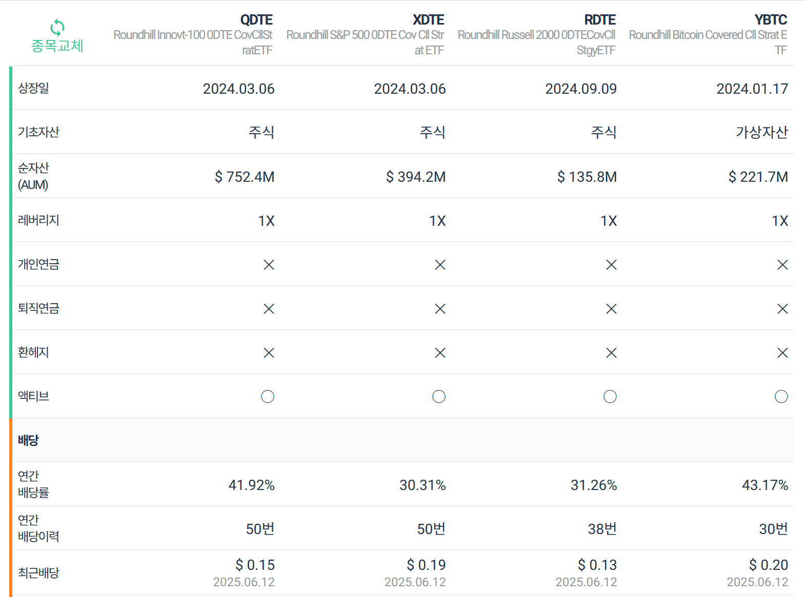 라운드힐의 대표적인 주배당 ETF로는 XDTE, QDTE, RDTE, YBTC 가 있는데 각각 S&P 500, 나스닥 100, 러셀 2000 지수, 비트코인을 기반으로 하고 있어요.