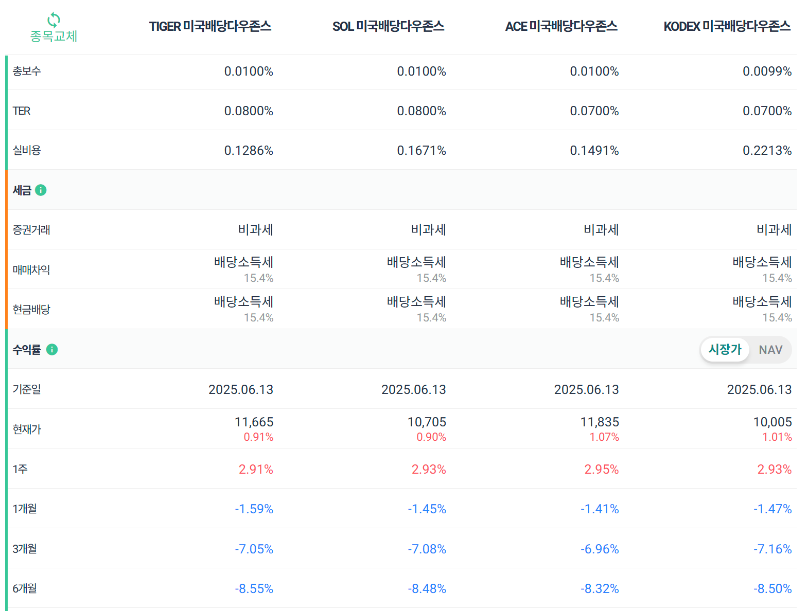 특히 SCHD는 미국의 재무건전성과 배당성향이 뛰어난 기업들에 집중 투자해서 단순 고배당보다도 훨씬 안정적인데, 국내상장 ETF로는 타미당, 에미당, 솔미당, 코미당이라 불리죠.(타이거미국배당다우존스, 에이스미국배당다우존스, 솔미국배당다우존스, 코덱스미국배당다우존스가 정식 명칭이랍니다)