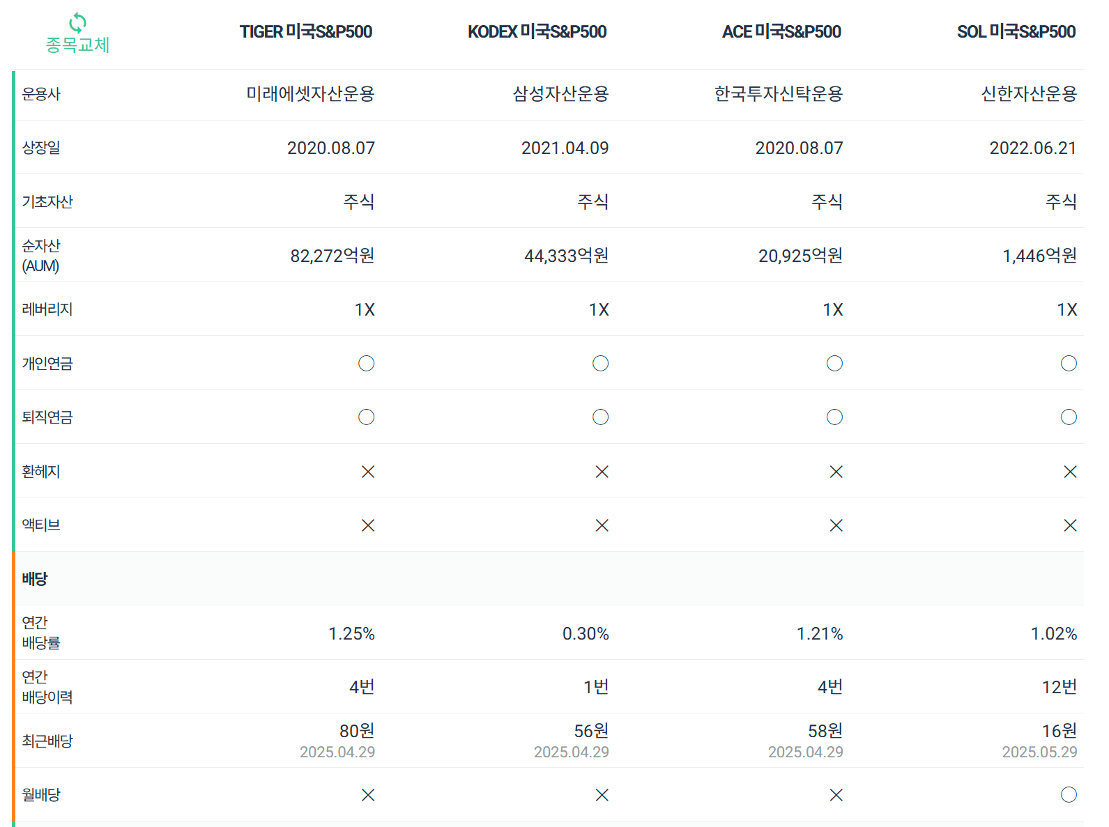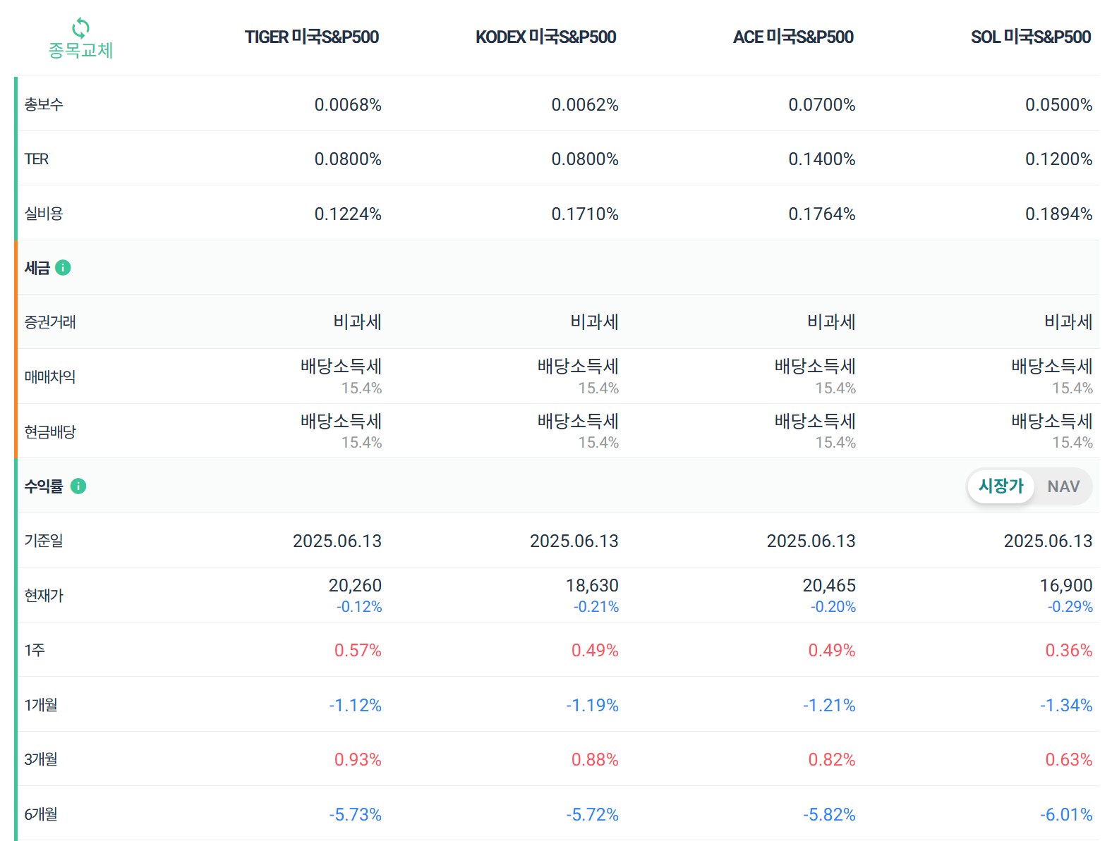 절세계좌에서는 해외상장 ETF를 투자할 수 없으니 S&P500의 국내 상장 상품인 TIGER미국 S&P500, ACE 미국S&P500, KODEX 미국S&P500 등 다양한 상품이 있는데요.