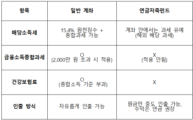 금융소득종합과세: 연금계좌는 종합과세 대상에서 제외돼요. 배당금이 2,000만 원을 넘어도 다른 소득과 합산되지 않아요.