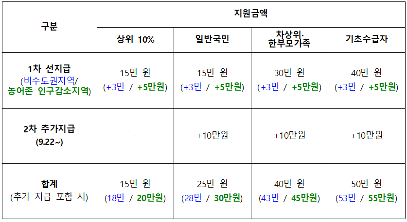 또한, 1차 지급에 이어 90% 국민에게 10만 원씩 추가 지급하는 2차 계획도 9월 22일부터 시행될 예정이에요. (이건 소득기준에 따라 따로 선별됩니다.)