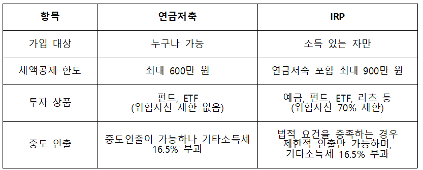 IRP (Individual Retirement Pension): 소득이 있는 사람만 가입 가능하고 퇴직금·추가 납입금을 운용하며, 연금저축 포함 최대 900만 원까지 세액공제 혜택이 있어요.