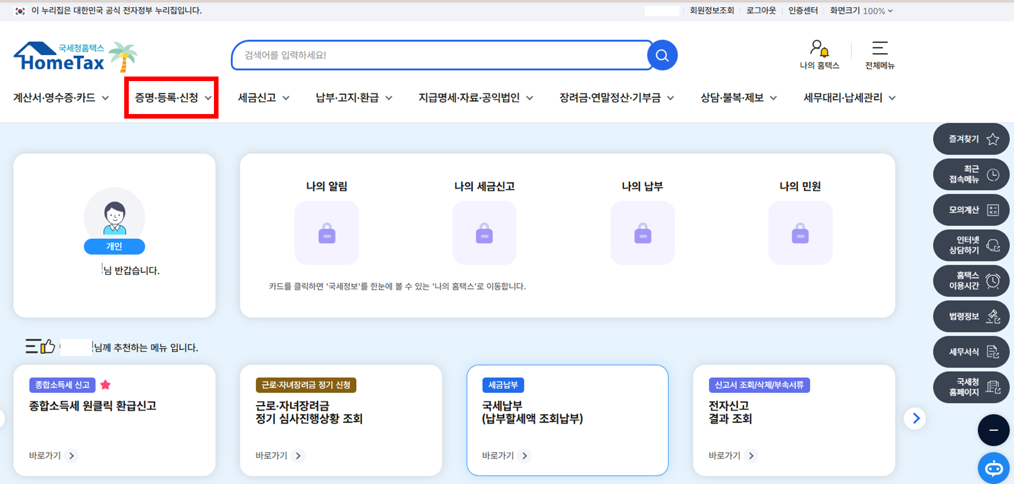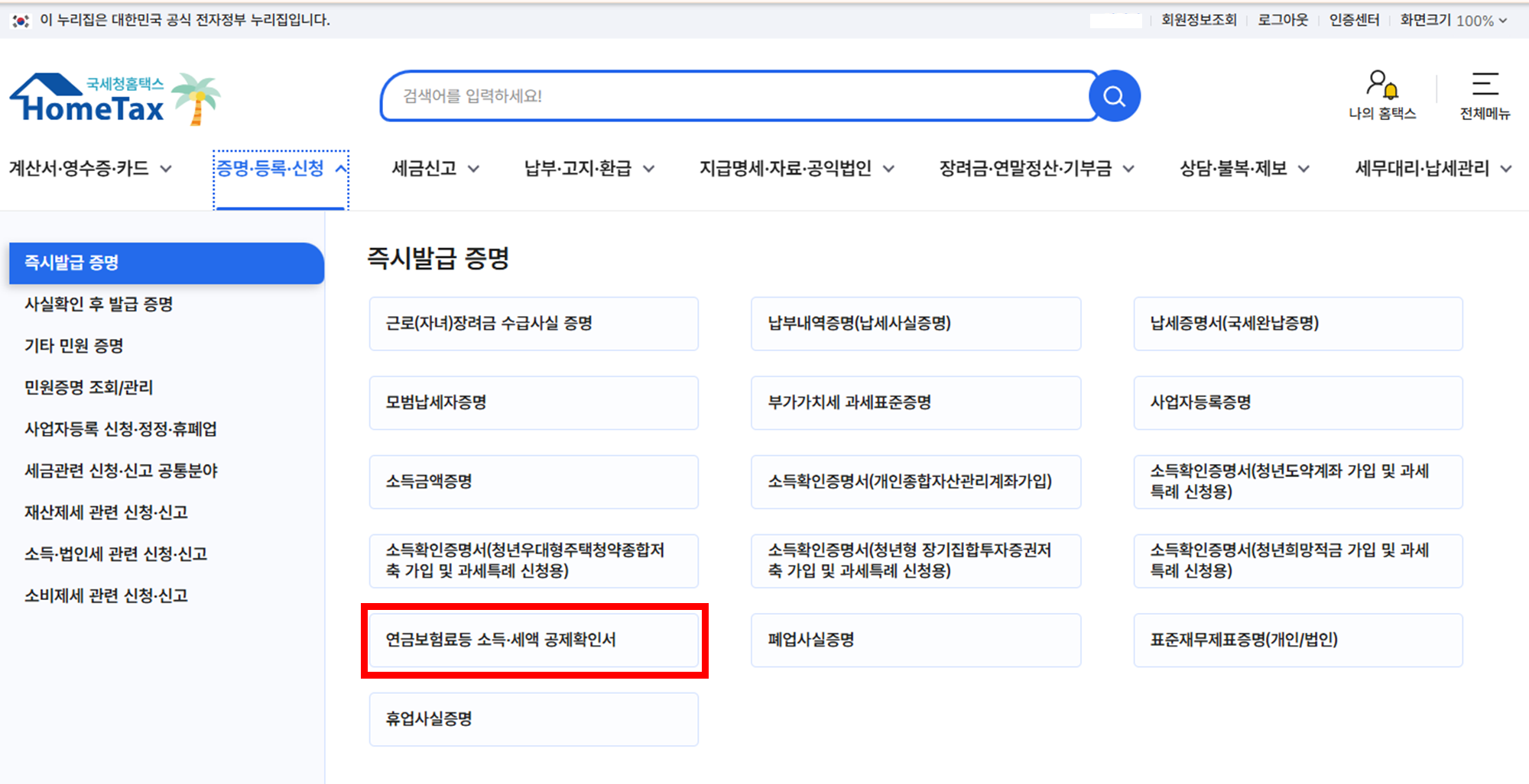 [ 증명 등록 신청] → [연금보험료 등 소득·세액공제 확인서] 신청 → 사용용도와 제출처 입력 → 신청