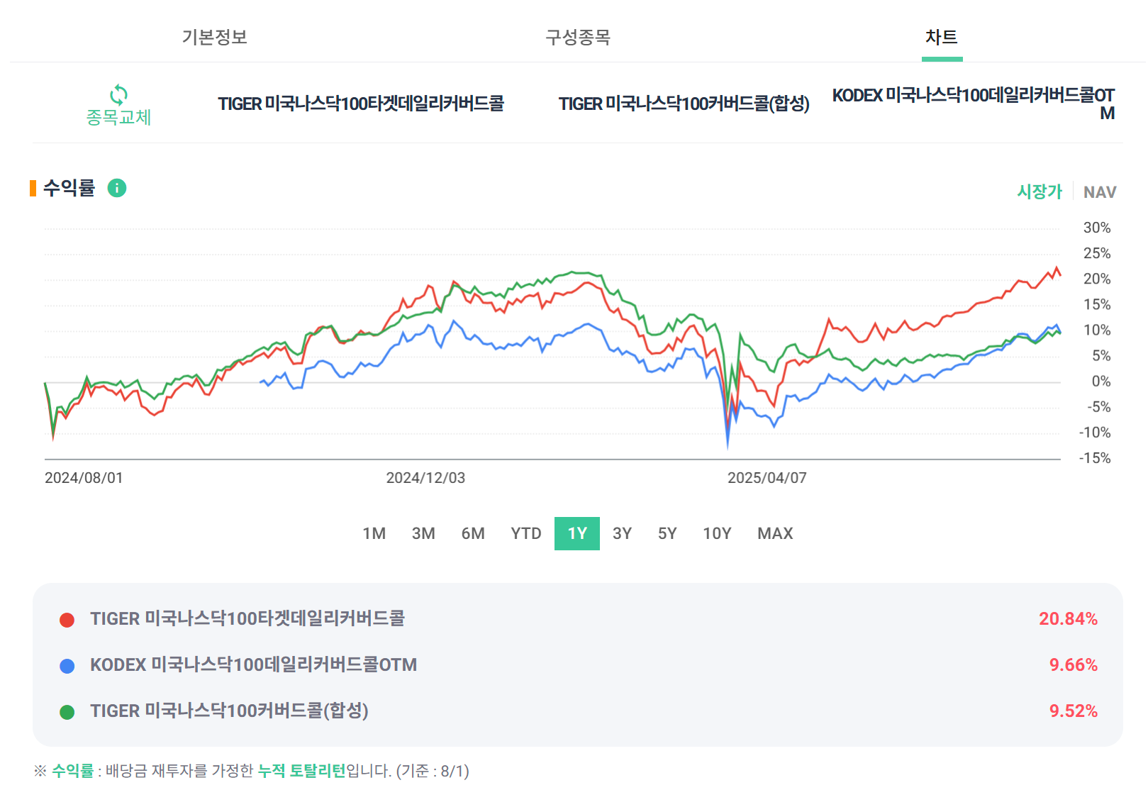 특히 최근 1년 수익률 기준으로는 TIGER미국나스닥타겟데일리커버드콜이 20% 이상 수익으로 성과가 좋네요.