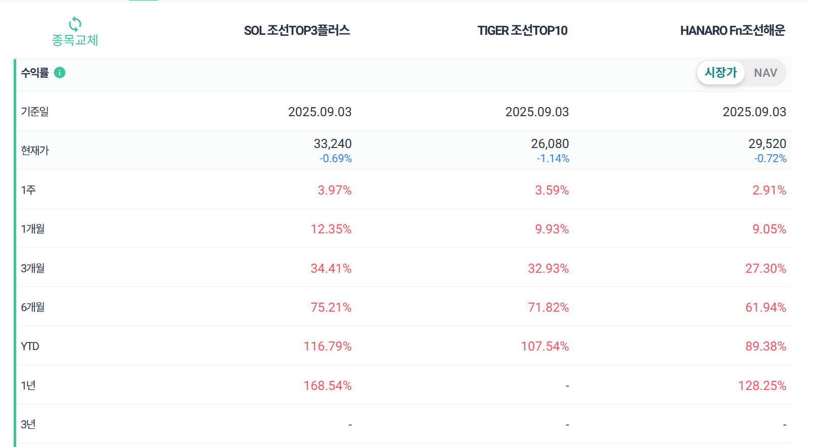 최근 1년간 수익률을 보면 SOL 조선 TOP3 플러스 > TIGER 조선 TOP10 > HANARO Fn조선해운 순으로 나오네요.