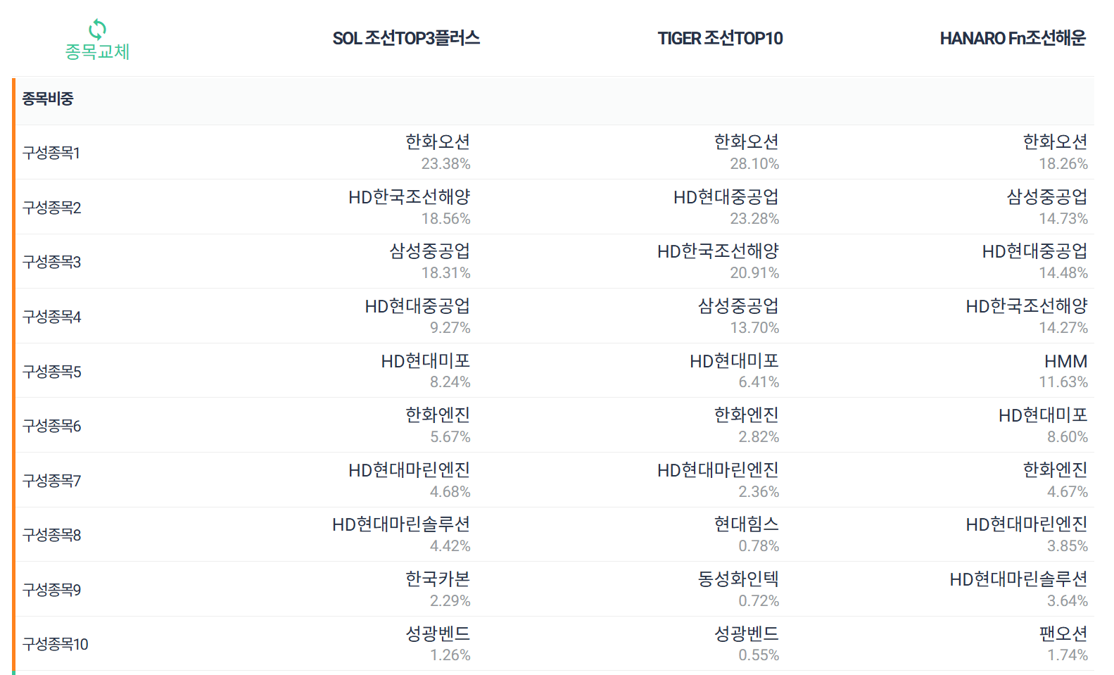 SOL이 가장 많이 올랐는데 상위 3개 조선사에 집중 투자하는 전략 덕분에 상승폭이 컸던 것 같아요.