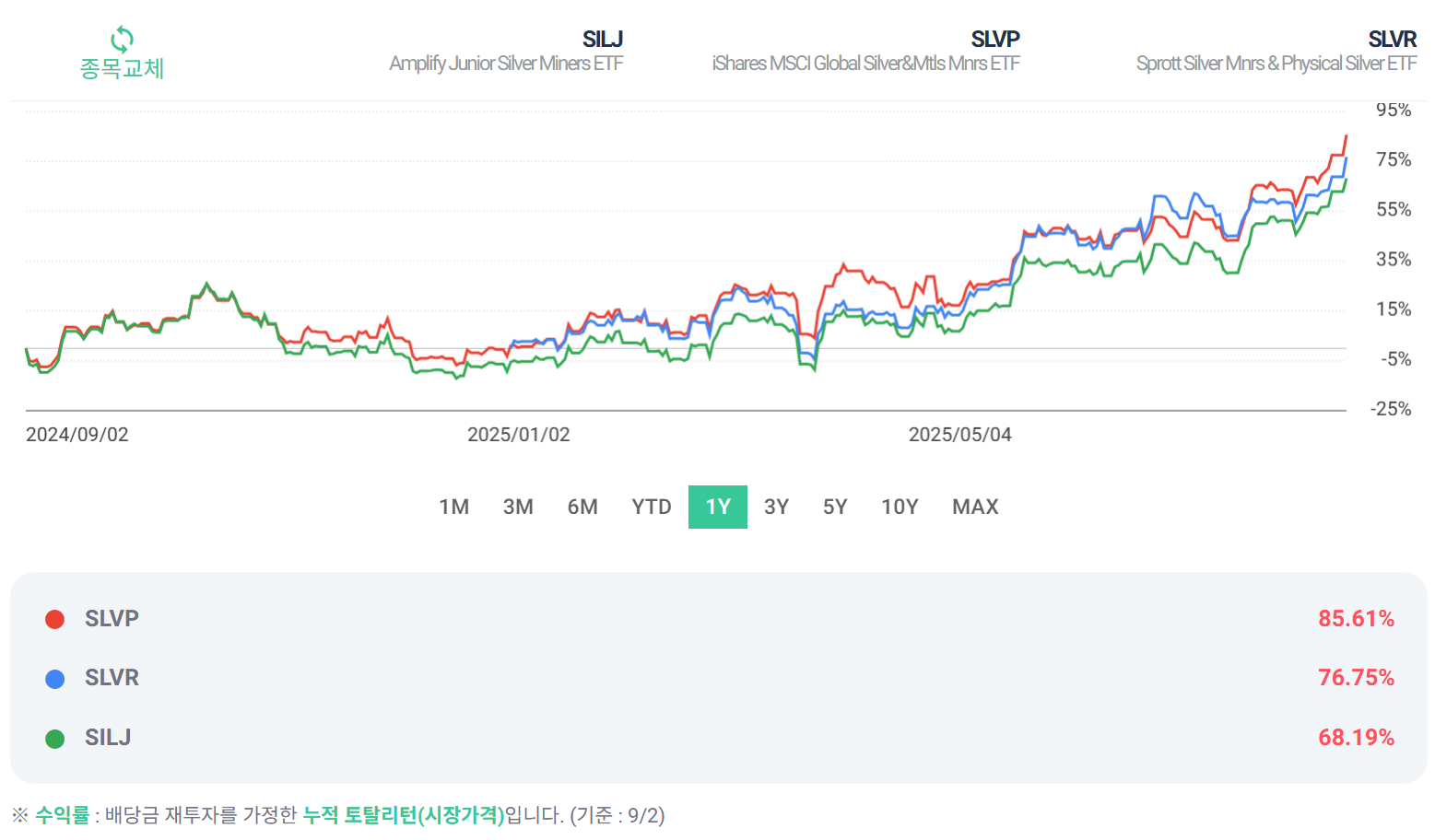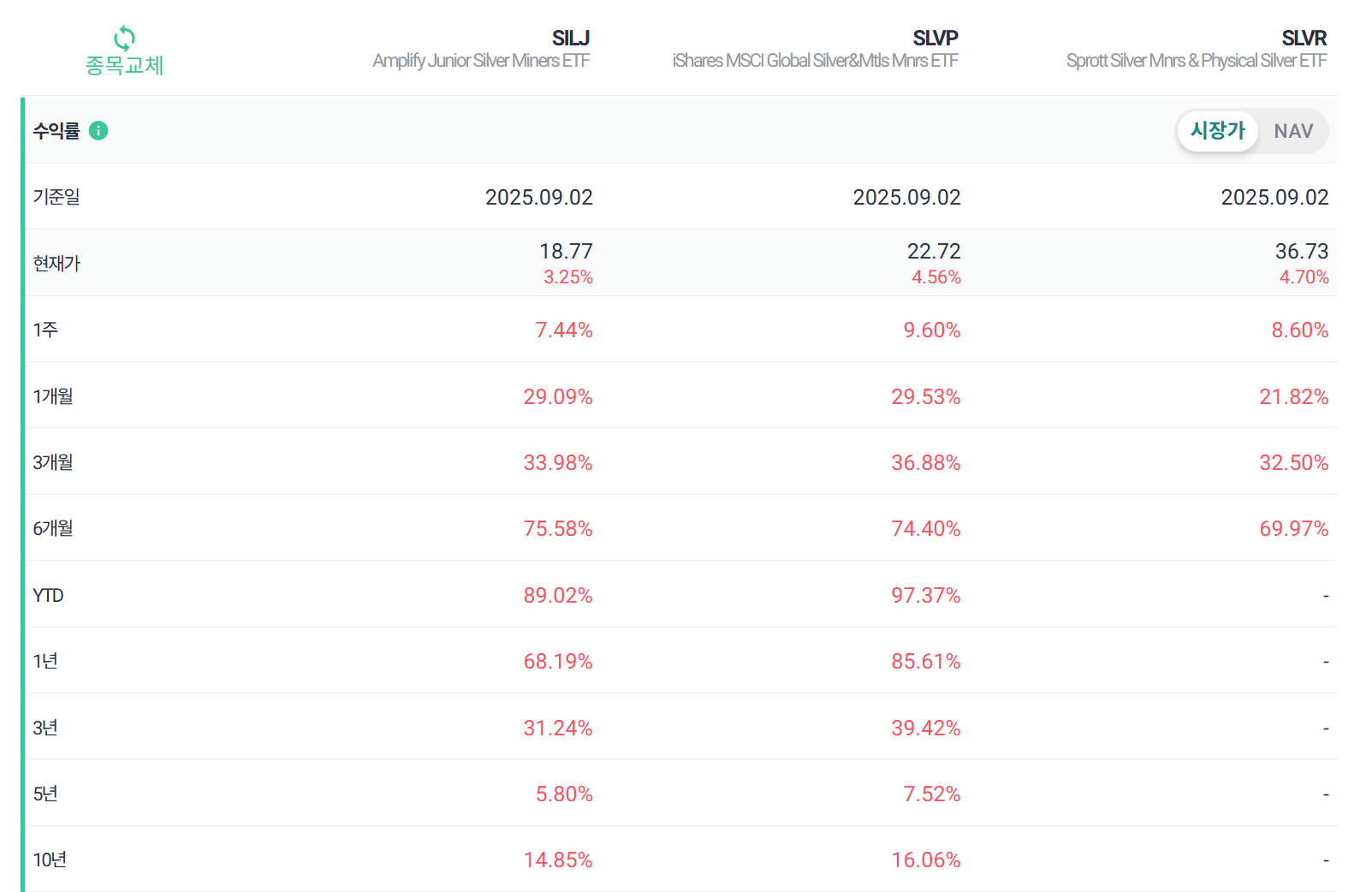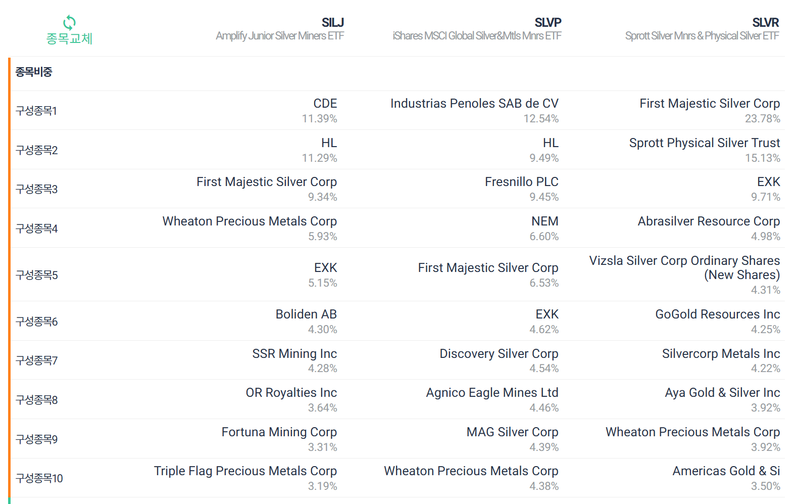 SLVP는 글로벌 대형 은광 기업 중심이라 안정적인 편이고, SLVR는 가장 최근에 나온 ETF인데 실물 은에 직접 투자하는 구조도 포함돼 있어요.
