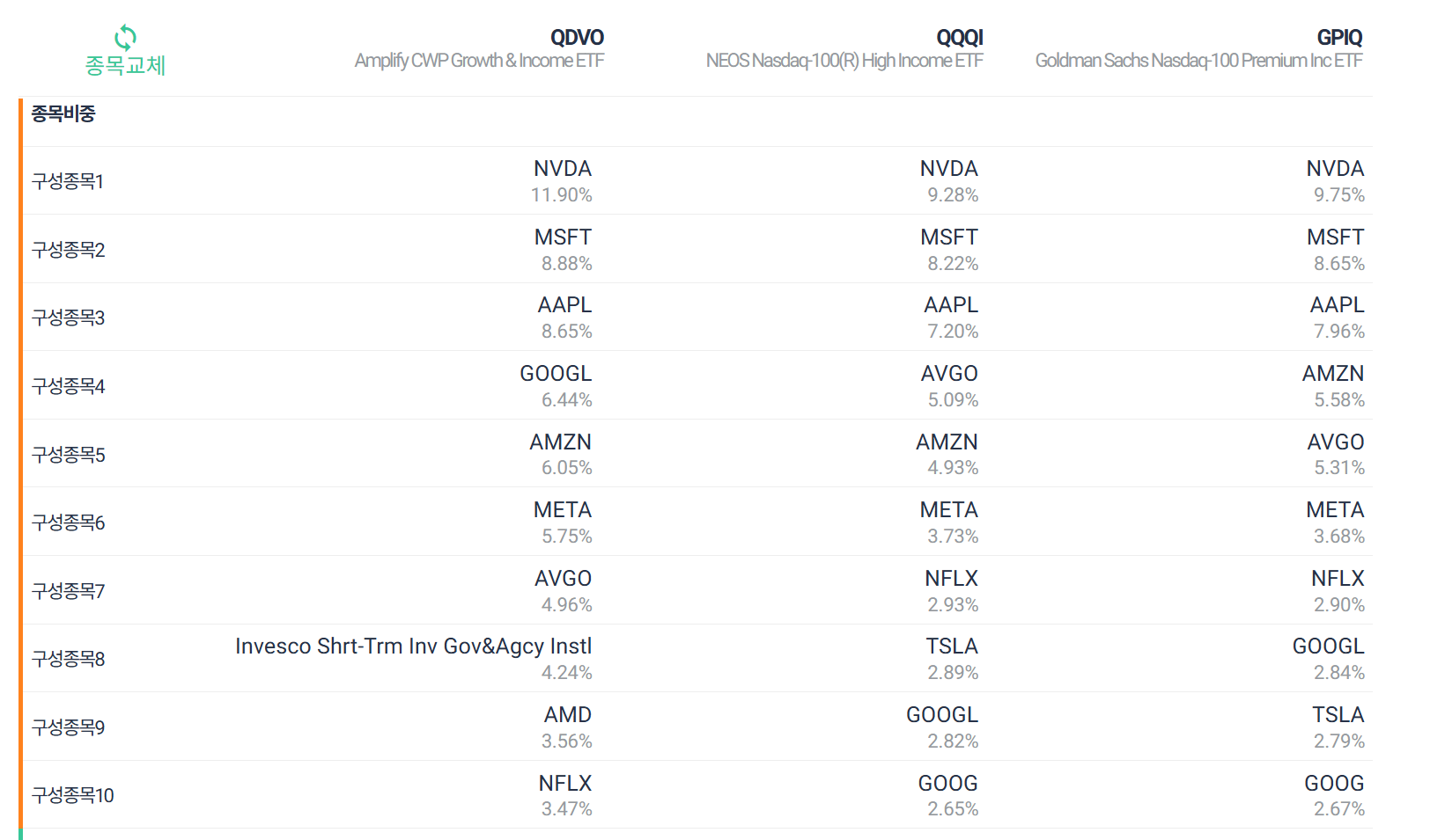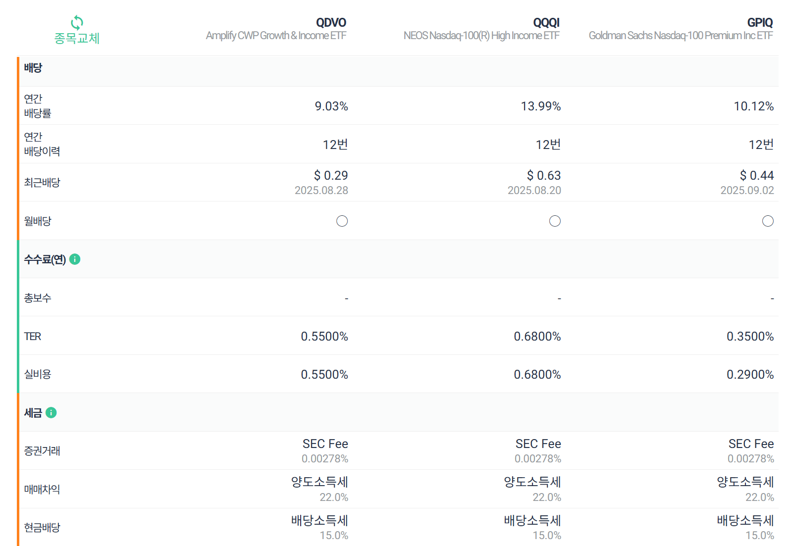 수익률은 QDVO > QQQI > GPIQ 순으로 높네요. 배당률도 높은 ETF인데 수익률도 나름 괜찮네요.