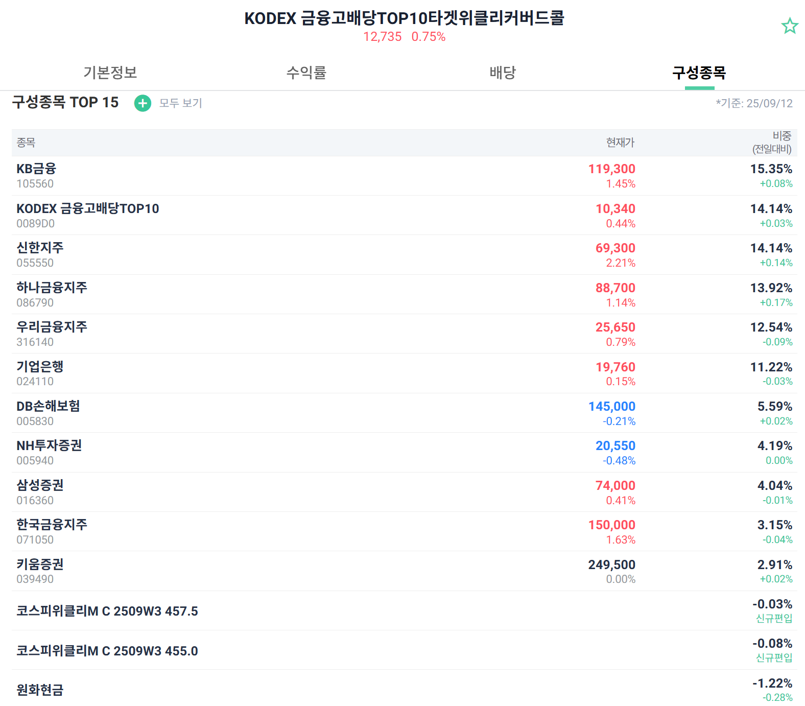 이 ETF는 국내 금융 섹터에서 배당이 높은 기업 위주로 담고 있는데요. 예를 들어 2025년 9월 기준으로 볼게요.
