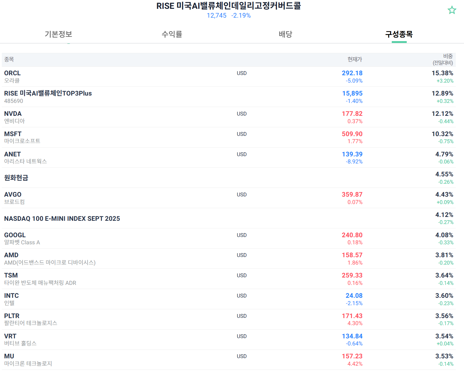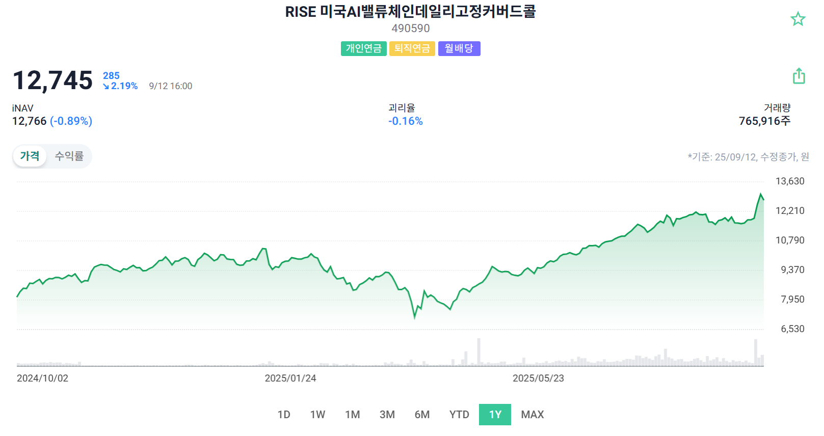 RISE 미국AI밸류체인데일리고정커버드콜 ETF는 AI 산업 성장에 투자하면서 꾸준한 배당 수익까지 챙길 수 있는 상품이에요.