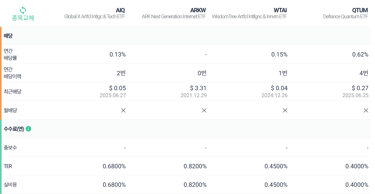 요즘 투자하면 빼놓을 수 없는 테마가 바로 AI(인공지능)죠. 챗GPT 이후로 AI 시장은 더 커지고 있고 관련 기업 주가도 많이 오르고 있어요. 그래서 오늘은 AI 관련 ETF 4종, AIQ / ARKW / WTAI / QTUM을 비교해 보려고 하는데요. 어떤 ETF가 나에게 맞는지 감을 잡을 수 있도록 수익률, 구성 종목, 배당, 수수료까지 싹 정리해 볼게요.