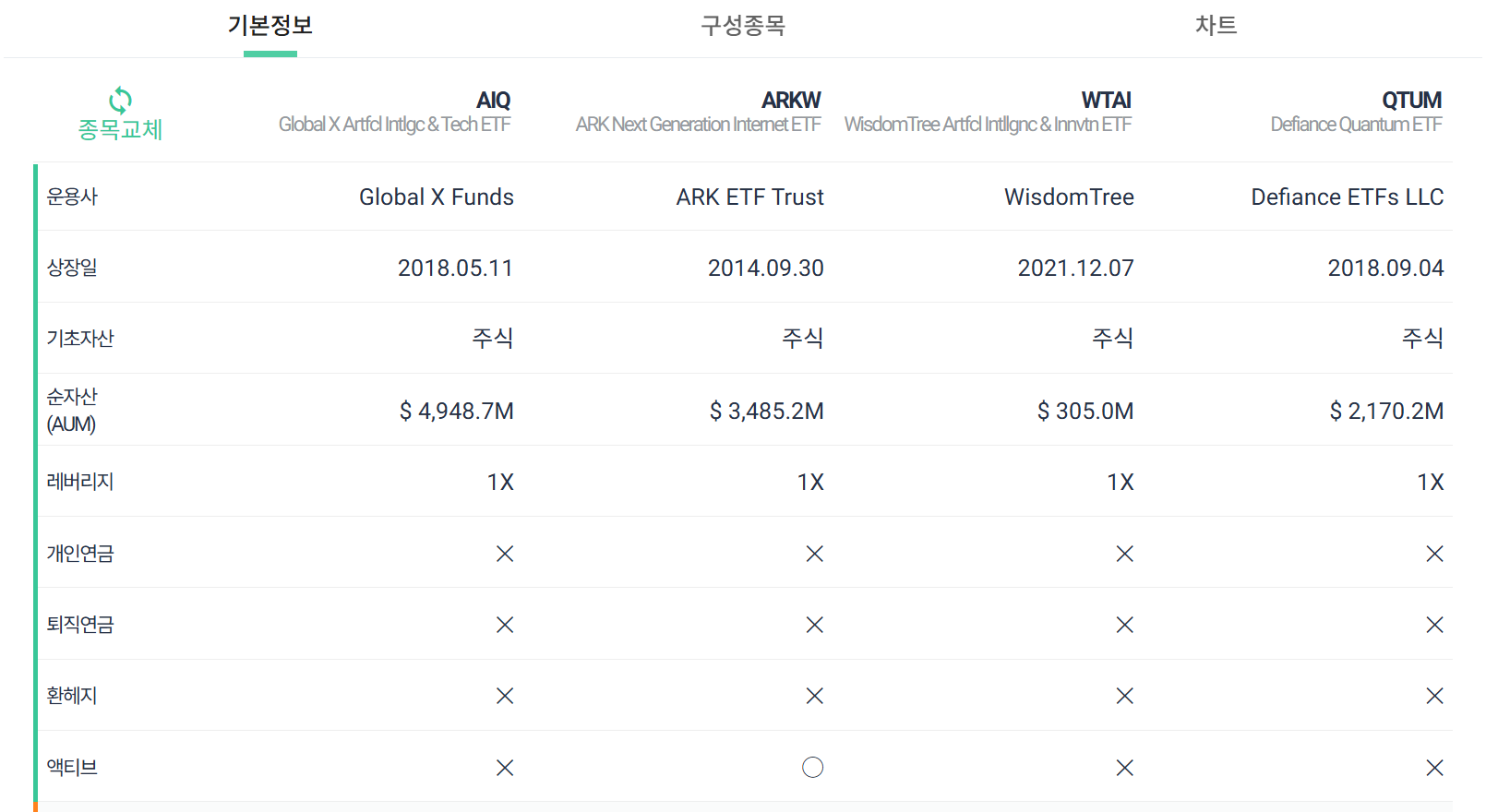 규모(AUM)가 크면 유동성도 좋고 거래가 편합니다. AIQ가 가장 크고 WTAI는 아직 작은 편이에요.