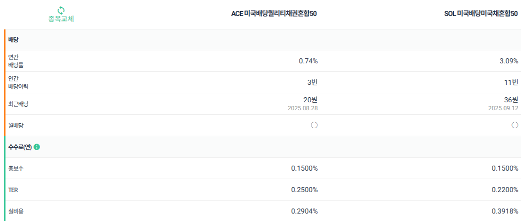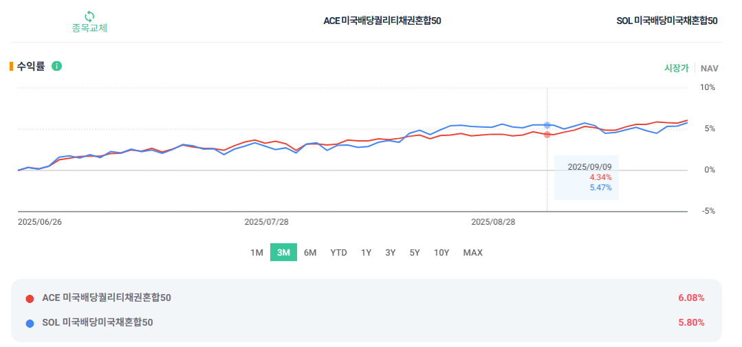 요즘 배당 ETF 관심 많으시죠? 특히 주식과 채권을 적절히 섞어서 안정성과 배당을 동시에 노리는 혼합형 ETF는 꾸준한 인기를 얻고 있어요. 오늘은 최근 많이 언급되는 ACE 미국배당퀄리티채권혼합50과 SOL 미국배당미국채혼합50을 비교해 볼게요.