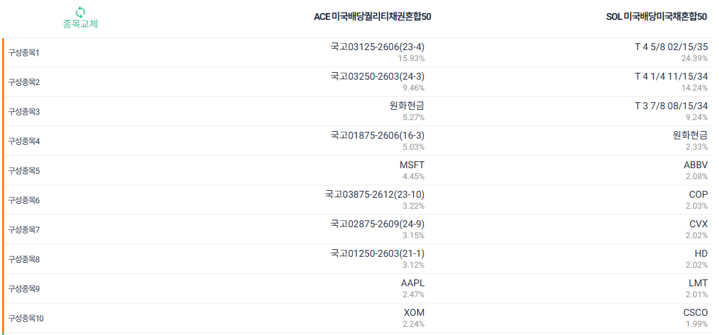 ACE는 한국 국고채 비중이 높고, SOL은 미국 국채 비중이 높아요.