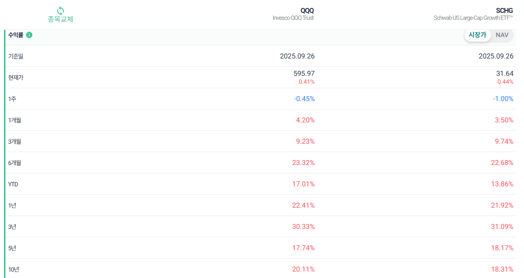 QQQ는 거의 IT 중심이고 SCHG는 좀 더 분산 투자된 느낌이에요. 그래서 QQQ는 기술주가 강세일 때 더 빠르게 오르지만 반대로 하락장에서는 더 크게 흔들릴 수 있어요.