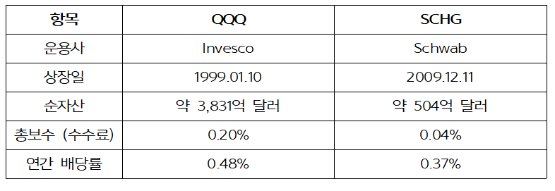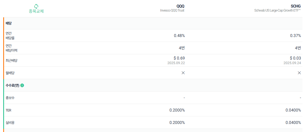 기술주에 대한 확신이 있고 장기적인 성장을 노린다면 QQQ가 매력적일 수 있고 좀 더 안정적인 흐름 속에서 꾸준한 수익을 원한다면 SCHG가 좋은 선택이 될 거예요.