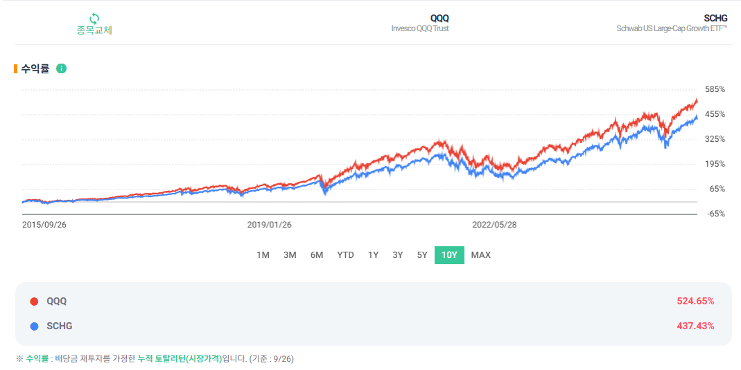 단기적으로는 SCHG가 조금 더 강세를 보였고, 장기적으로는 QQQ가 더 높은 수익률을 기록했어요. 특히 10년 누적 수익률은 QQQ가 524.65%, SCHG가 437.43%로 꽤 차이가 나죠.