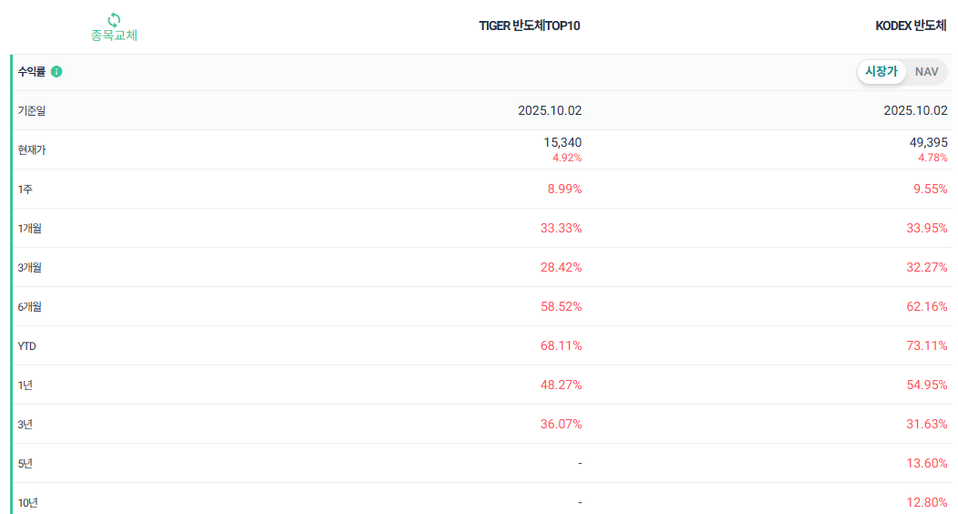 KODEX 반도체는 오래된 ETF라서 안정감이 있고 배당도 더 높은 편이에요. 최근 단기 성과도 살짝 앞서는 모습이에요.