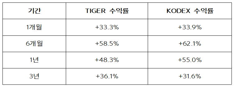 단기적으로는 KODEX 반도체가 살짝 더 좋은 성과를 낸 걸 볼 수 있어요. 특히 1년 수익률은 KODEX가 55% 정도 되네요.