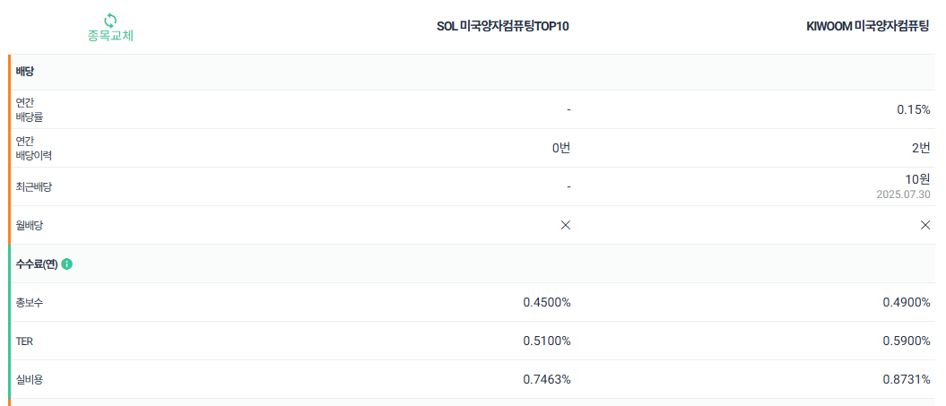 반면 KIWOOM 미국양자컴퓨팅은 배당을 지급하면서 여러 종목에 분산 투자하는 구조라 안정적인 흐름을 보여줘요. 다만 SOL처럼 단기적으로 큰 수익을 기대하기는 어려울 것 같아요.