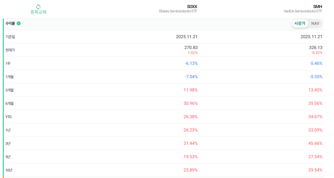 2025년 11월 기준 성과를 보면 대부분 SMH가 SOXX보다 조금씩 높게 나타나고 있어요.