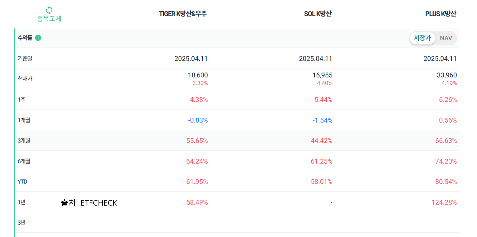 특징: 한국 방산주 중심, 높은 수익률 기록 (6개월 기준 +74% 등)