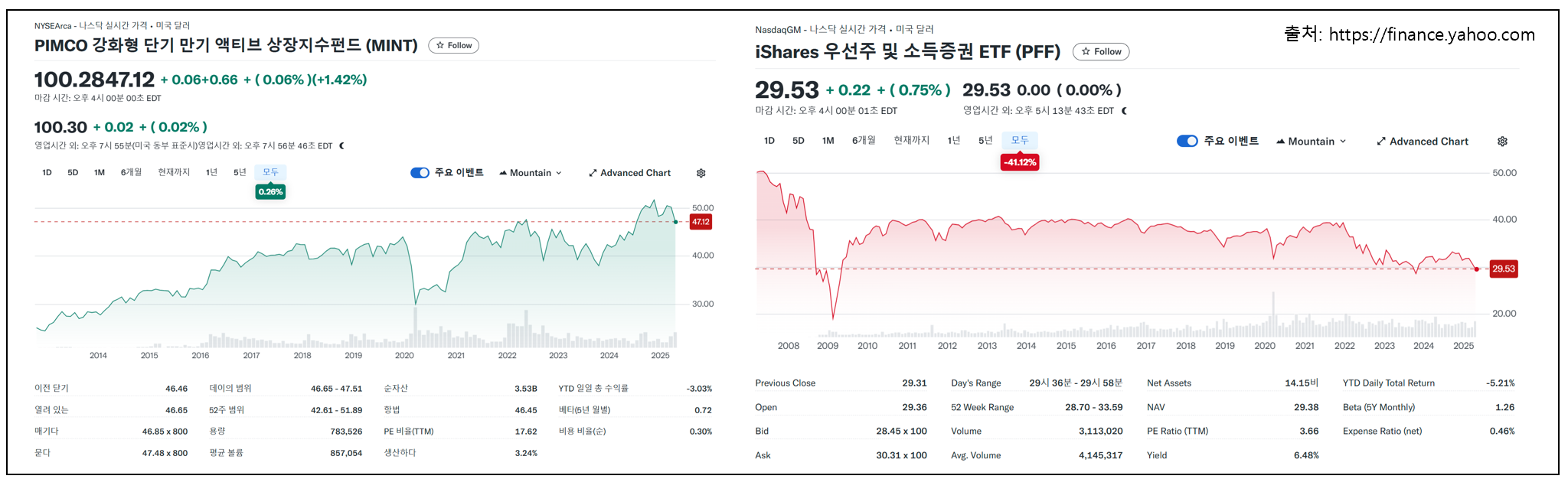 PFF | 우선주 및 하이브리드 증권 | 0.30% | 3.24% | 안정적인 배당 제공 |