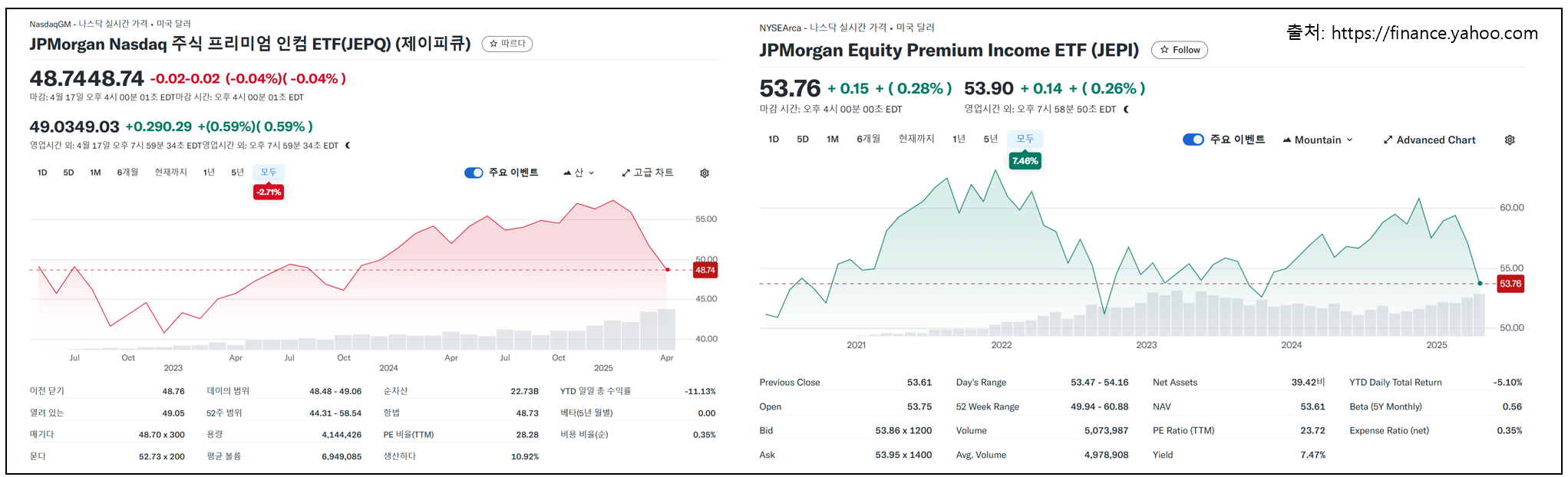 JEPI | 애플, 마이크로소프트, 유나이티드헬스, 코카콜라 등 | 0.35% | 7.47% | 대형 우량주 + 커버드콜 전략, 상대적으로 안정적 |