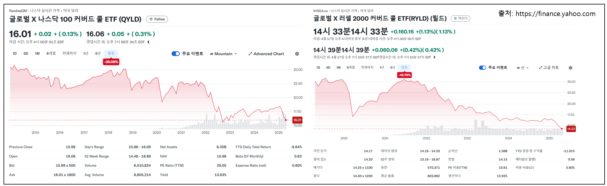 QYLD | 나스닥 100 (애플, 구글, 테슬라 등 포함) | 0.60% | 13.63% | 나스닥 100 전체에 커버드콜, 고배당이지만 성장성 낮음 |