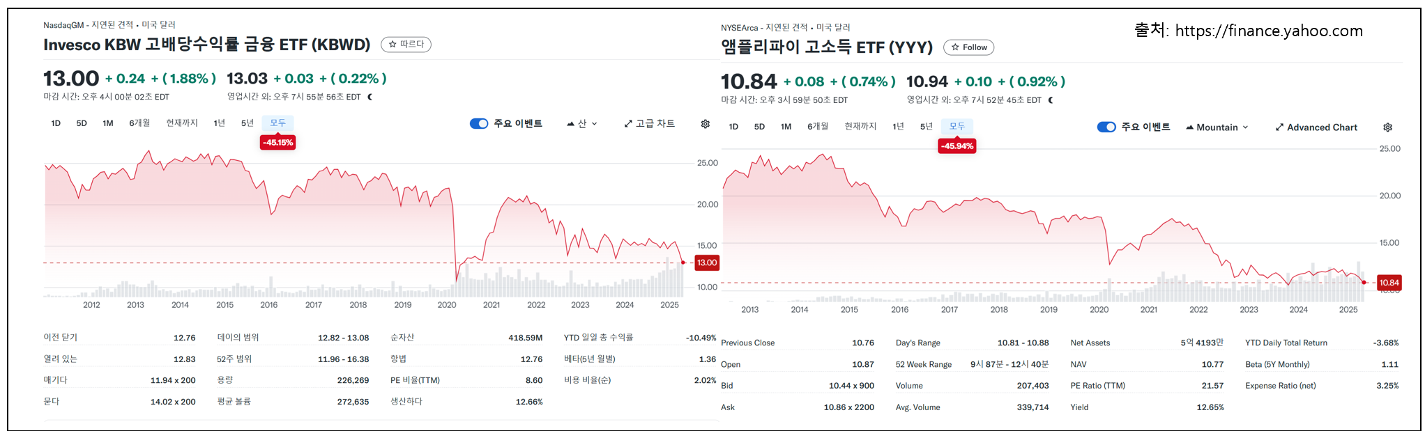KBWD | 미국 금융 섹터 고배당 주식 | 2.02% | 12.66% | 금융 섹터의 고배당주에 집중 투자 |