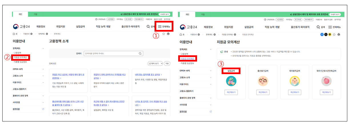 고용노동부 사이트에 접속 - 전체메뉴 - 이용안내 - 지원금 모의계산 - 실업급여 순서로 해보시면 됩니다.