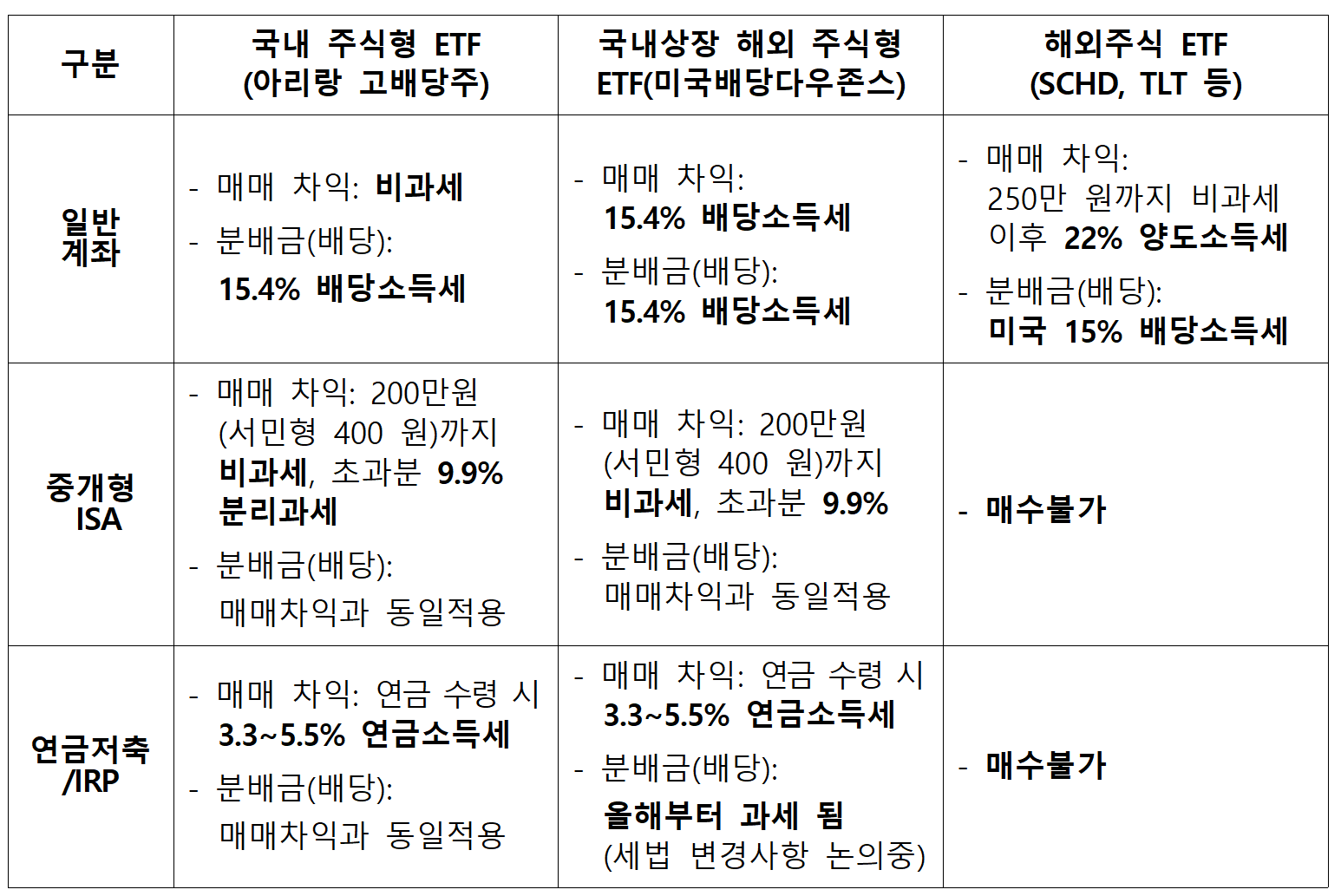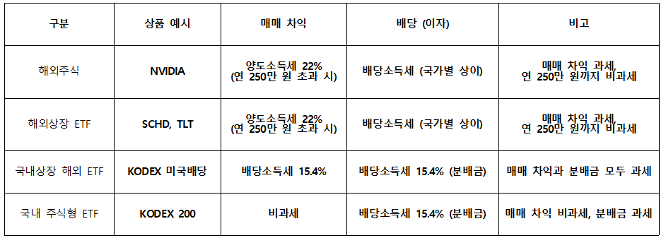 마지막으로 해외 주식 시장에 직접 상장된 ETF를 살펴볼게요. 예를 들어 우리가 많이 들어본 SCHD나 TLT 같은 ETF를 샀다가 가격이 올라서 판 매매 차익에는 22%의 양도소득세가 붙어요.