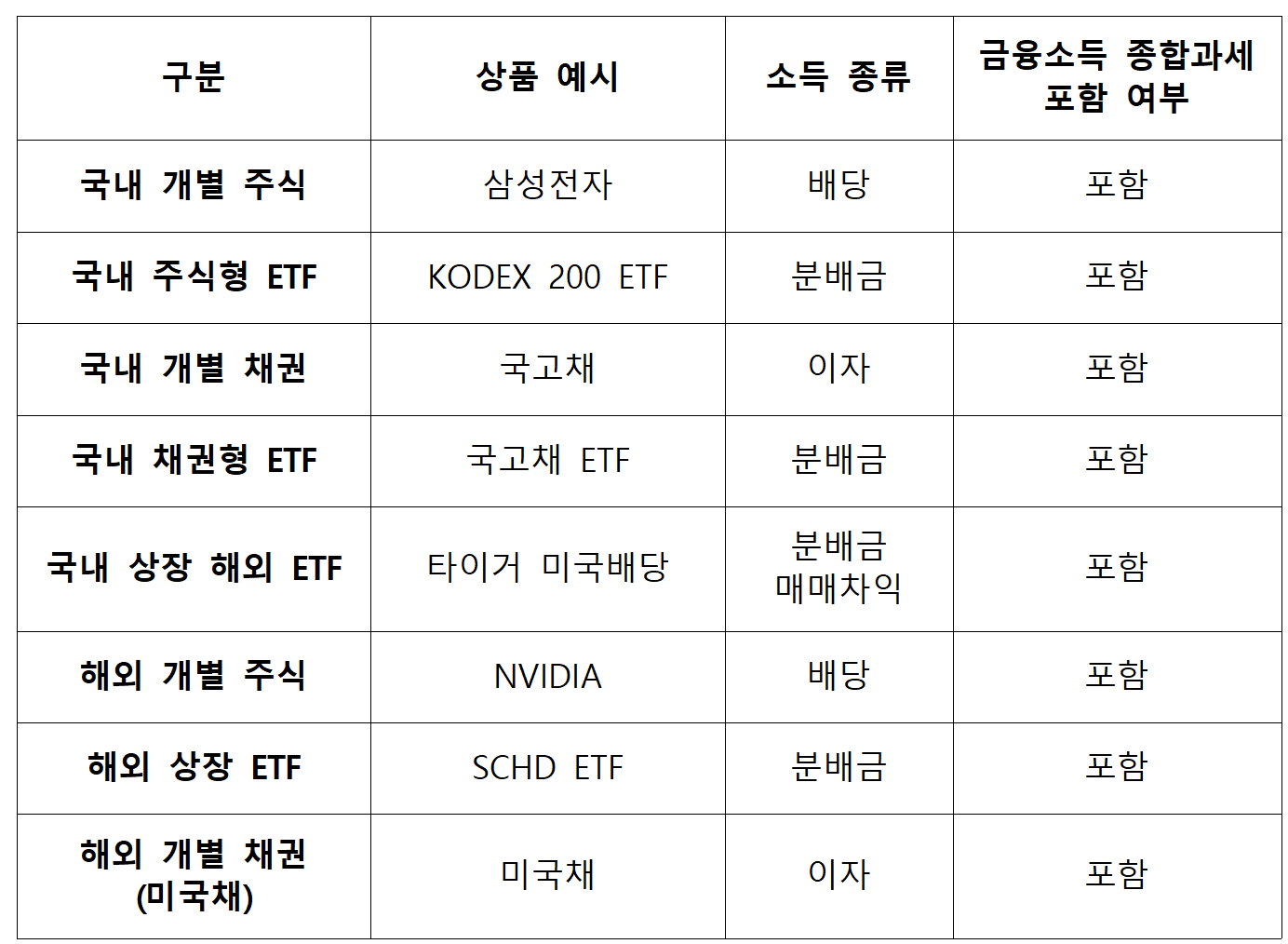 우리가 은행에 돈 넣어놓고 받는 이자나 채권을 사서 꼬박꼬박 받는 이자, 그리고 주식 투자해서 받는 배당금, 그리고 펀드에 투자해서 받는 분배금 같은 것들 있잖아요? 신기하게도 이게 전부 "금융소득**으로 묶인대요! 이게 한국에서 받든, 외국에서 받든, 돈을 사용하게 해 주고 받는 소득이면 대부분 금융소득이라고 생각하시면 편하답니다.