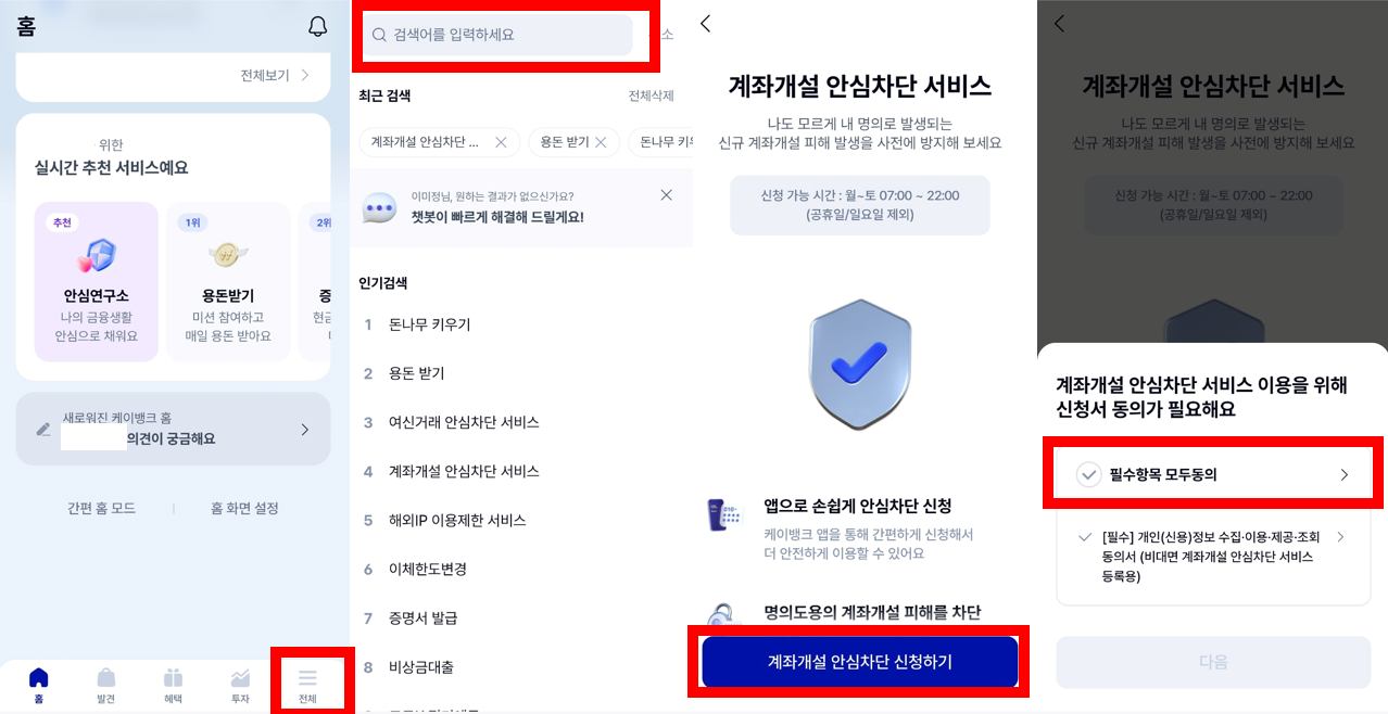 ③ 검색하기(돋보기): 돋보기에서 "계좌개설 안심차단 서비스' 검색하기