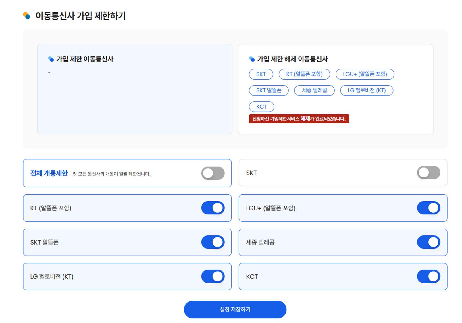 내 명의 가입 현황 확인이 했다면 다시 엠세이프 메인 화면으로 돌아와서 [가입 제한 서비스]를 클릭해 보세요. 요즘처럼 개인 정보 유출이 불안한 환경에서는 현재 사용 중인 서비스를 제외하고 모두 차단해 두는 것이 안전한데요. 이렇게 설정해 두면 혹시 누군가가 내 명의로 몰래 통신 서비스를 개통하려고 시도하더라도 사전에 차단할 수 있답니다.