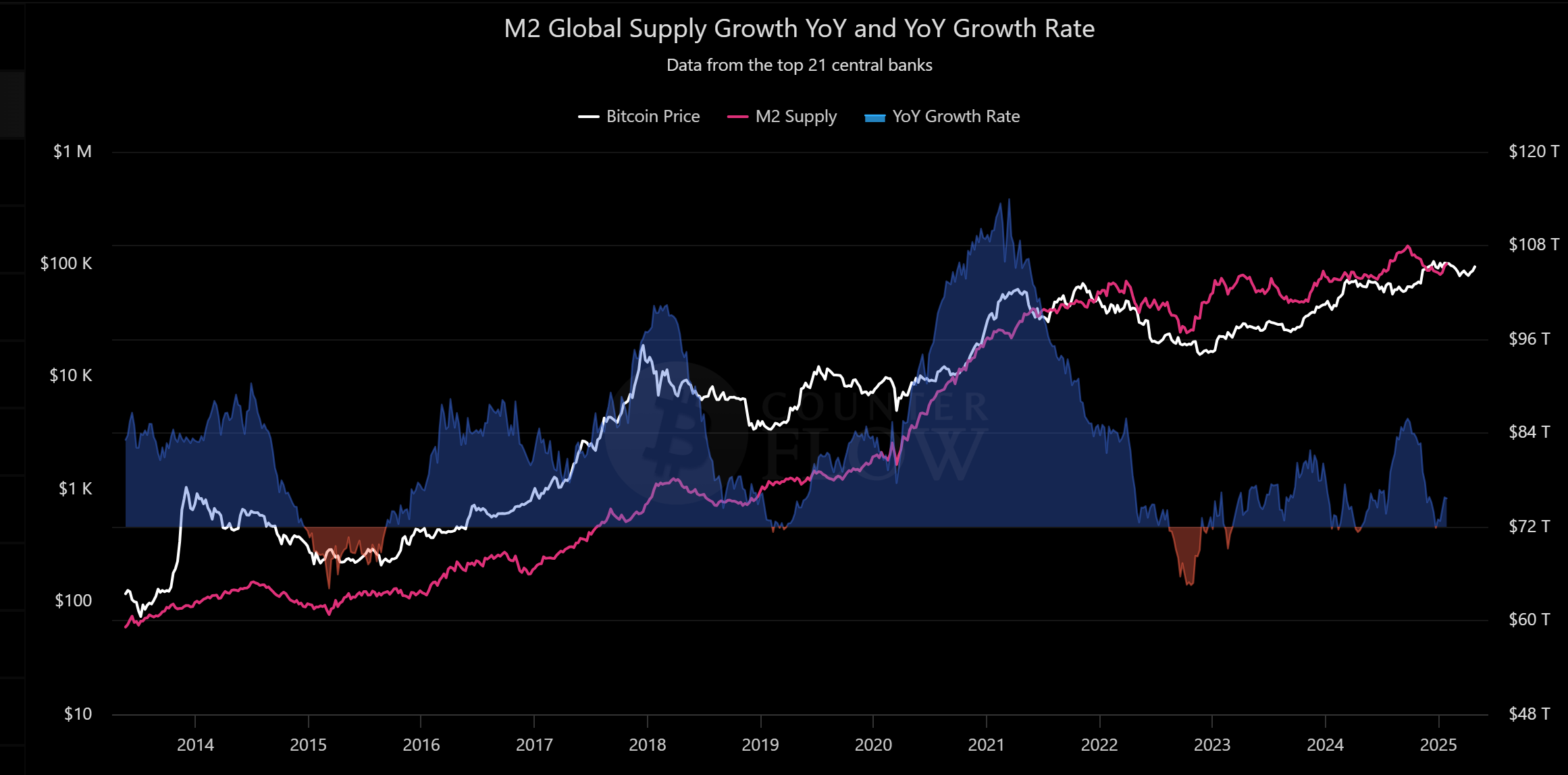 2025년 4월 비트코인 상승장의 주요 배경을 살펴보면 M2 글로벌 통화량 증가가 중요한 요인으로 작용했음을 알 수 있는데요.